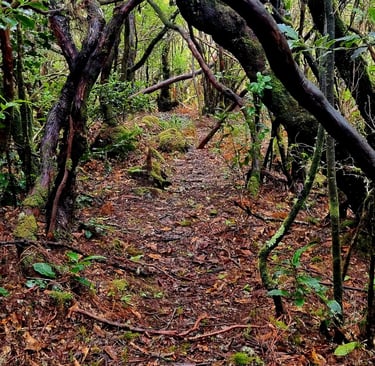 Après une demi-heure de marche, je rejoins une levada. Le chemin est donc parfaitement plat. La difficulté réside plutôt dans la nature du sol et l'état de la forêt : au sol, flaques d'eau et boue se succèdent. Je dois jongler : un coup je passe par la droite sur le talus, un coup je passe par la gauche en montant sur le muret de la levada. Attention à ne pas tomber dans l'eau !