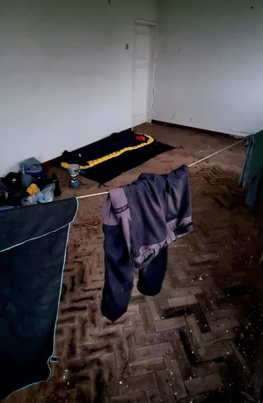 Je m'installe alors discrètement dans cette pièce principale. C'est d'ailleurs la seule qui soit accessible : la porte qui mène au couloir est fermée à clé. Je tire une corde pour faire sécher mon linge, mange et me couche dès la tombée de la nuit.